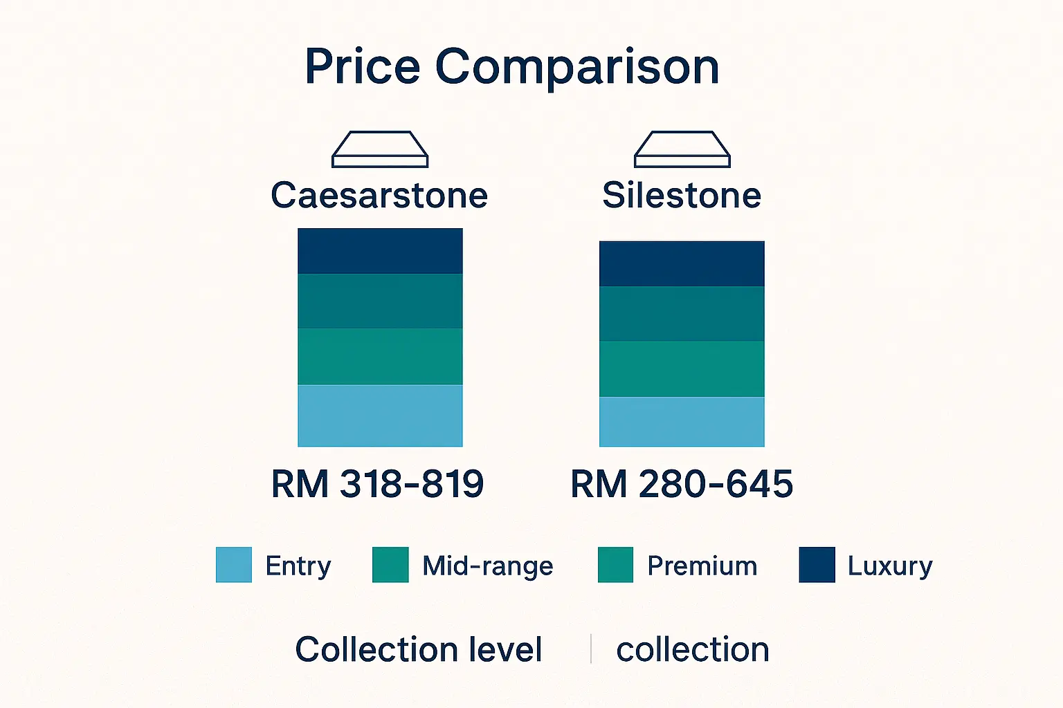 - Q: Is the price difference between Caesarstone and Silestone big in Malaysia? A: Depends which collection you choose. At entry to mid-range, Silestone actually cheaper (RM 280-450/sq ft vs Caesarstone's RM 318-573/sq ft). But for premium marble-look designs, Caesarstone's Supernatural Premium (RM 664-819/sq ft) is more expensive than Silestone's luxury range (RM 580-645/sq ft). For average kitchen, difference can be from saving RM 1,500 with Silestone to paying RM 7,000 more for top Caesarstone.