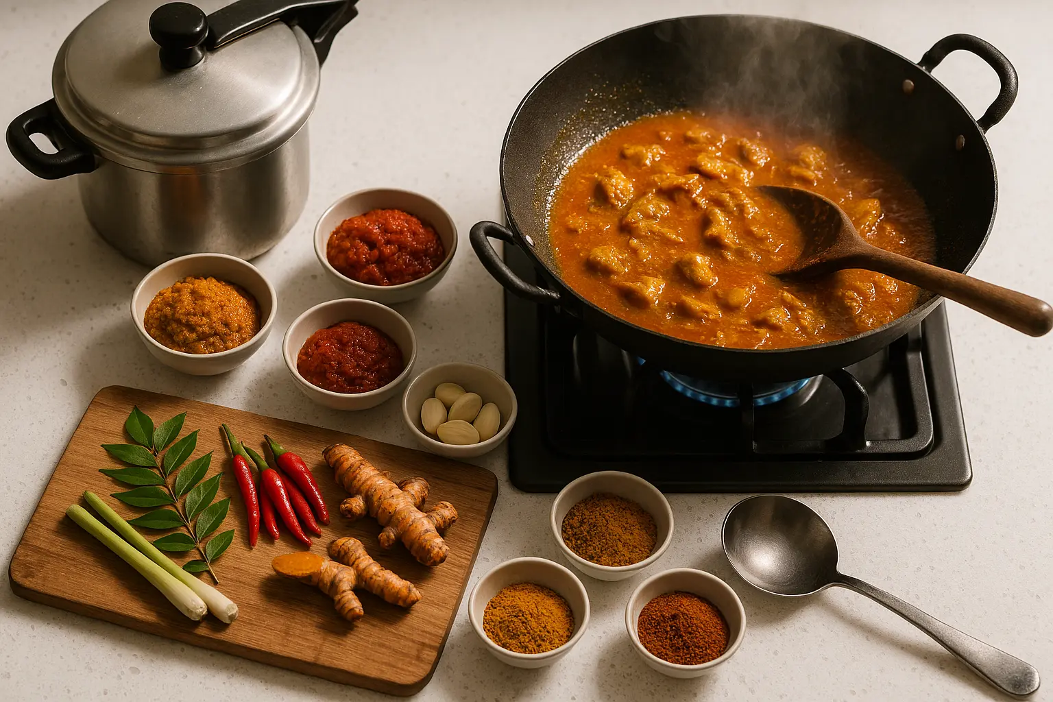 Malaysian cooking means turmeric, curry, sambal, kicap, and so many things that can stain. This is where engineered surfaces really shine: