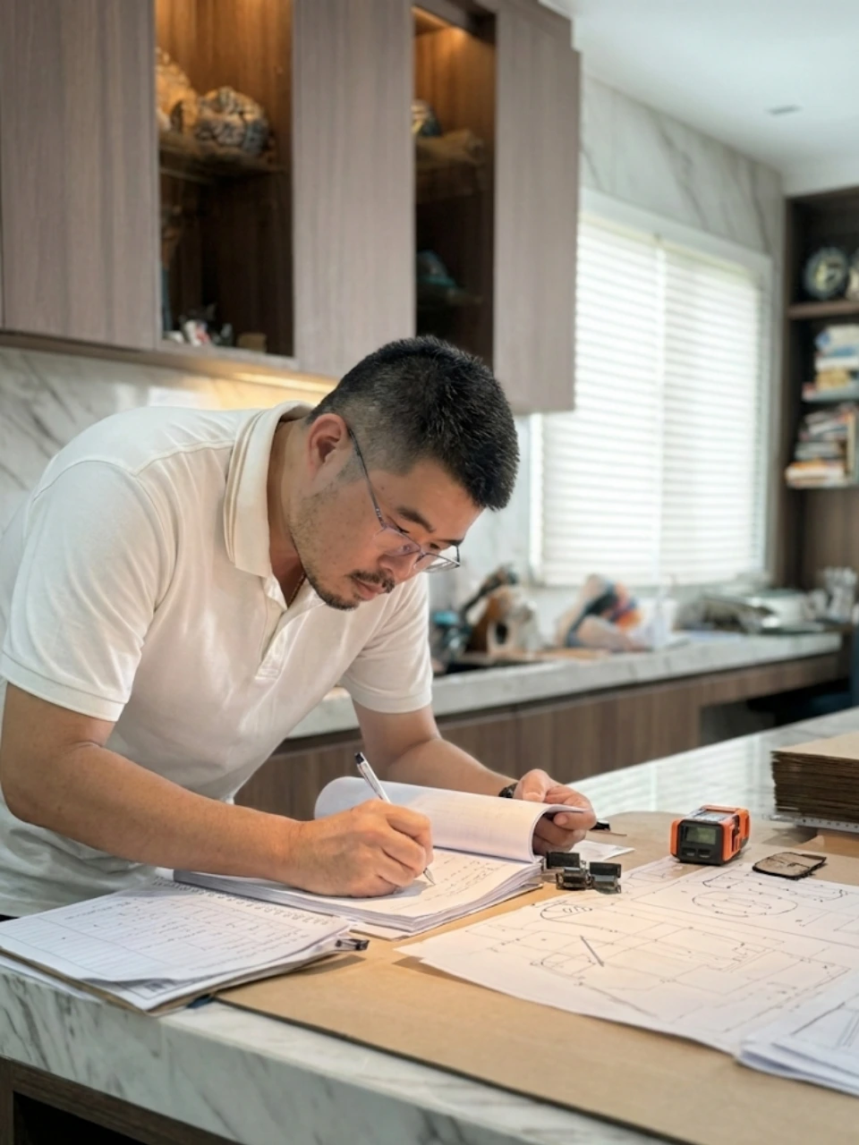 In a recent project in Subang Jaya, we discovered a 15mm variance in wall straightness over a 2.4-metre run. If the homeowner had simply provided measurements to a tiler, the countertop would have had visible gaps along the wall.